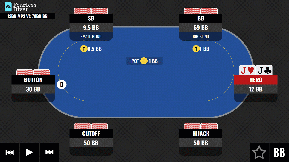 At a Tournament Final Table you minraise 2BBs from MP2 with a 12BB stack and the Big Blind with 70BBs calls. Play millions of Game Theory Optimal solved hands In Position.